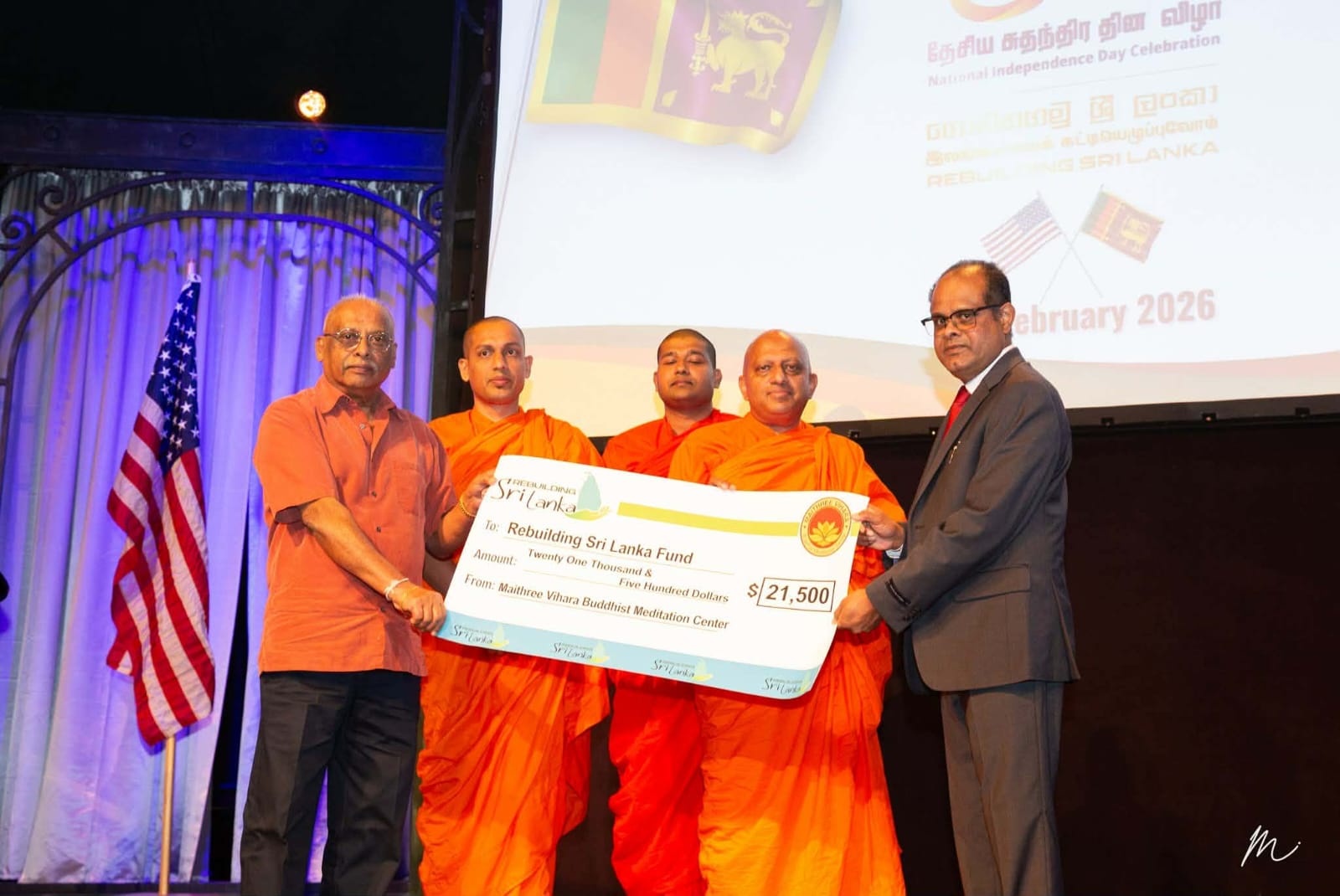 This financial donation was formally handed over to the Consul General of Sri Lanka on National Independence Day, which fell on 4 February, under the guidance of the Chief Incumbent of the Sun Valley Maithree Vihara in Southern California, Venerable Dr Aparakke Punyasiri Thera.