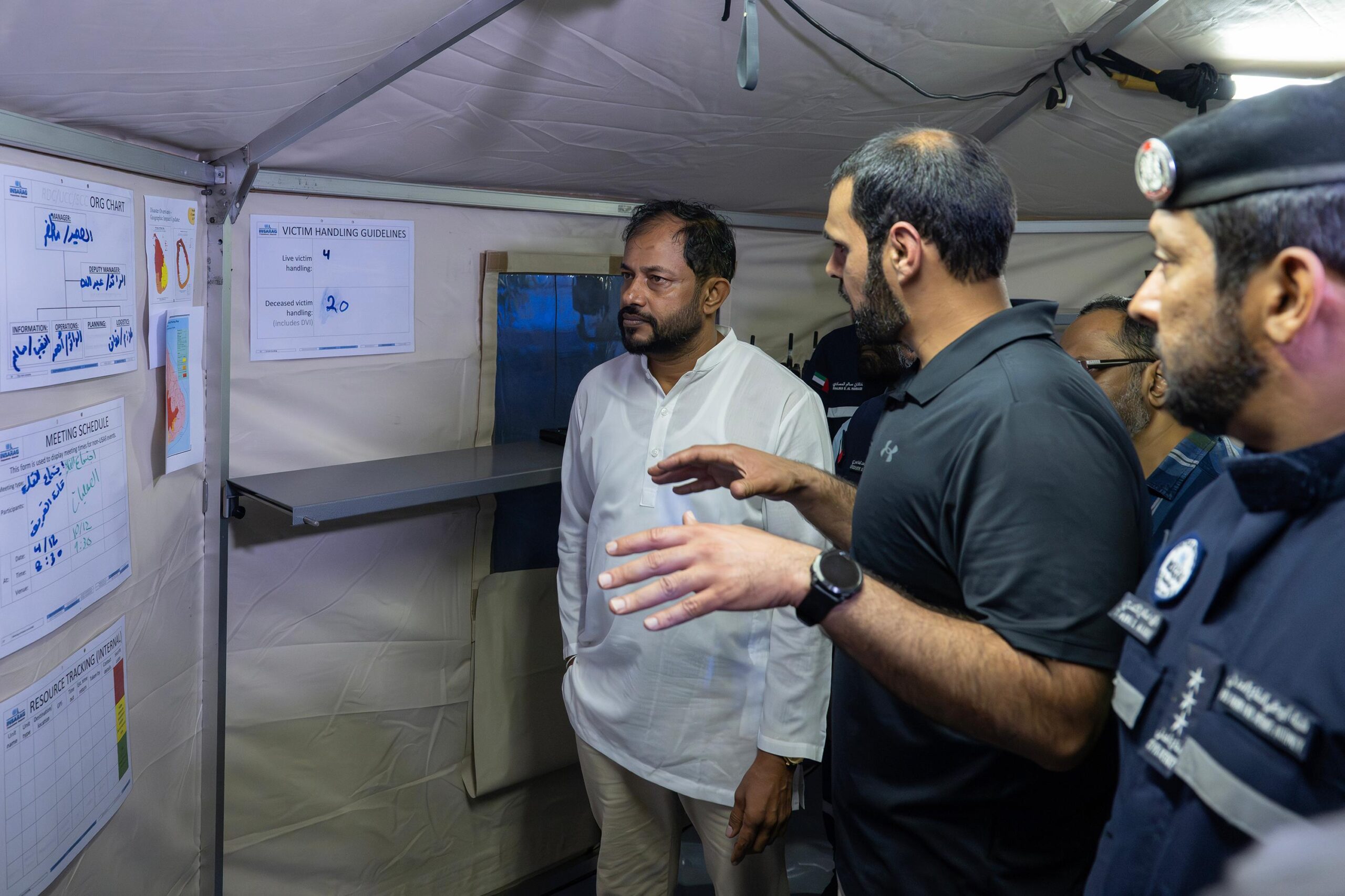 During the visit, the Deputy Mayor was briefed on the progress of search and rescue operations, the teams’ operational workflow, and the ongoing distribution of humanitarian aid. The UAE team comprises representatives from the Joint Operations Command, the UAE International Aid Agency, the Emirates Red Crescent, and the Abu Dhabi Civil Defense Authority.