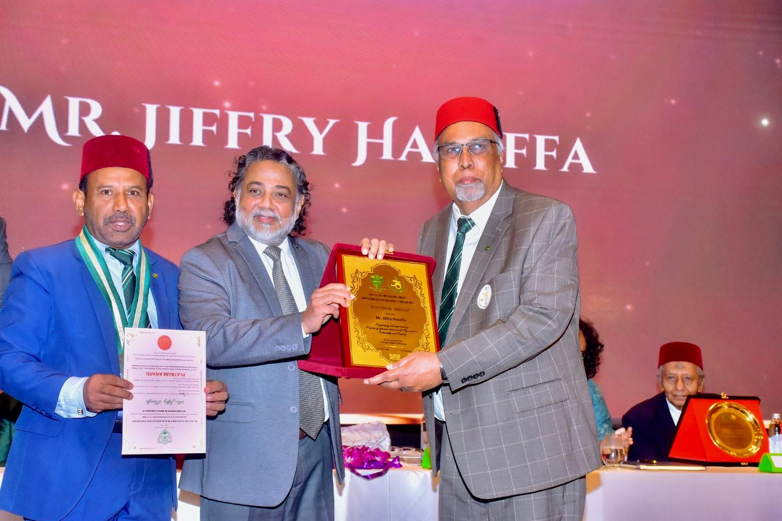 COLOMBO; Senior past president of the All-Ceylon YMMA Conference, Melbourne-based Jiffry Haniffa was honoured for his 50 years of services with a platinum award at 75th Annual Convention of the All-Ceylon YMMA Conference held under the patronage of the Prime Minister Dr .Harini Amarasuriya at the Cinnamon Life Hotel in Colombo on Monday, Oct.20.