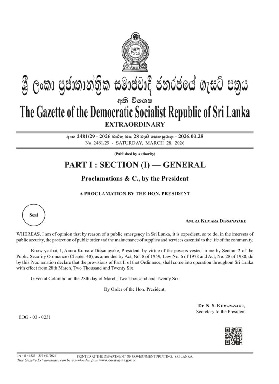 This decision has been taken in view of the disaster situation caused by the Cyclone ‘‘Ditwah,’’ with the aim of ensuring public safety, maintaining normalcy in the country, and continuing the supply of essential services required for daily life.