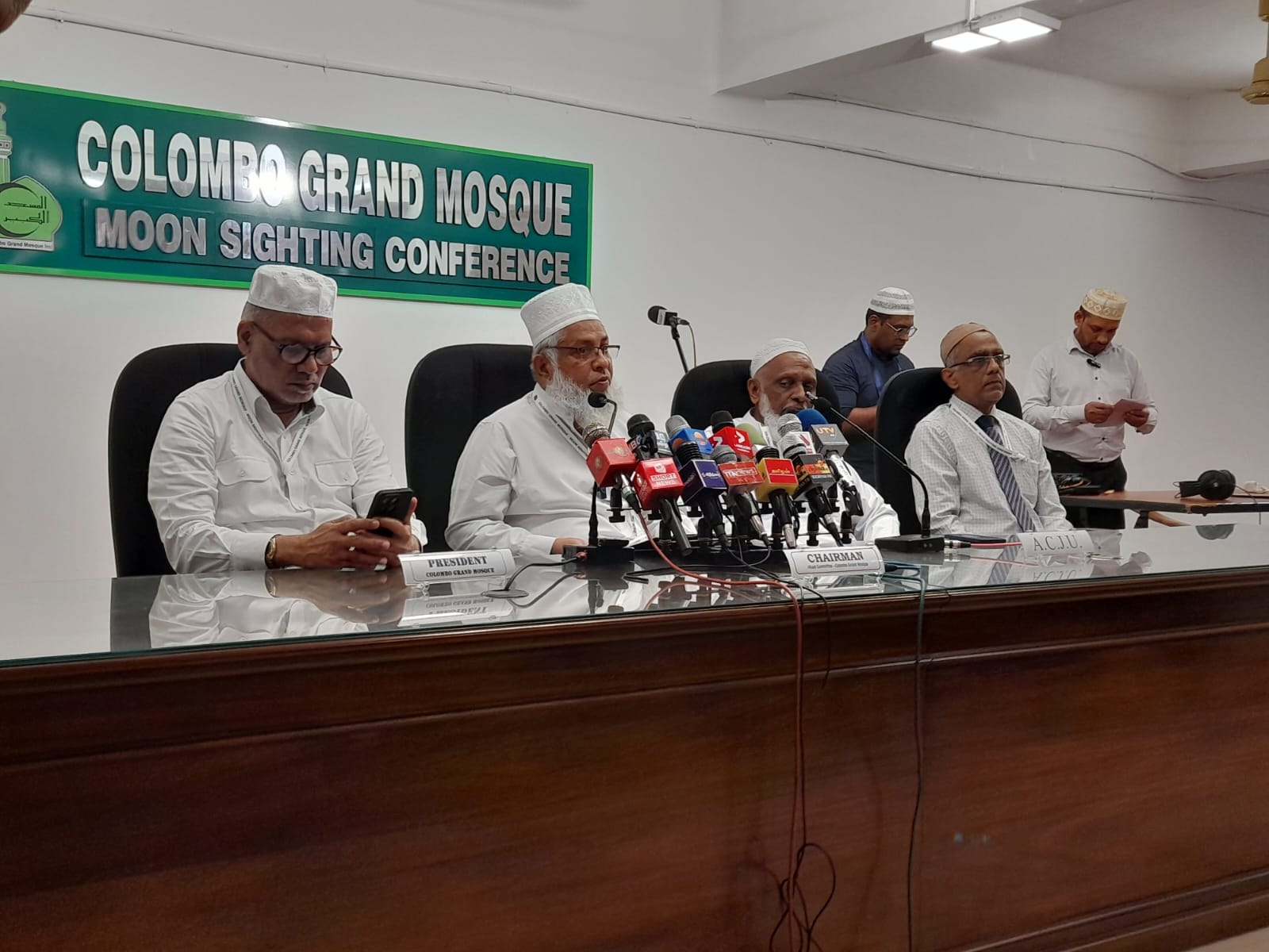 Muslim Religious and Cultural Affairs Department Director M.S.M. Nawas, All Ceylon Jamiyyathul Ulama Vice President Moulavi M.H.M. Burhan, Colombo Grand Mosque Hilal Committee Chairman Moulavi Hasham Fathahi , Colombo Grand Mosque Trustee Thahir Razeen with Trustees of the Mosque and Ulamas were present.,photos ASM JAVID