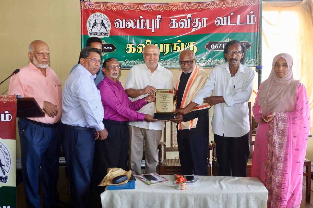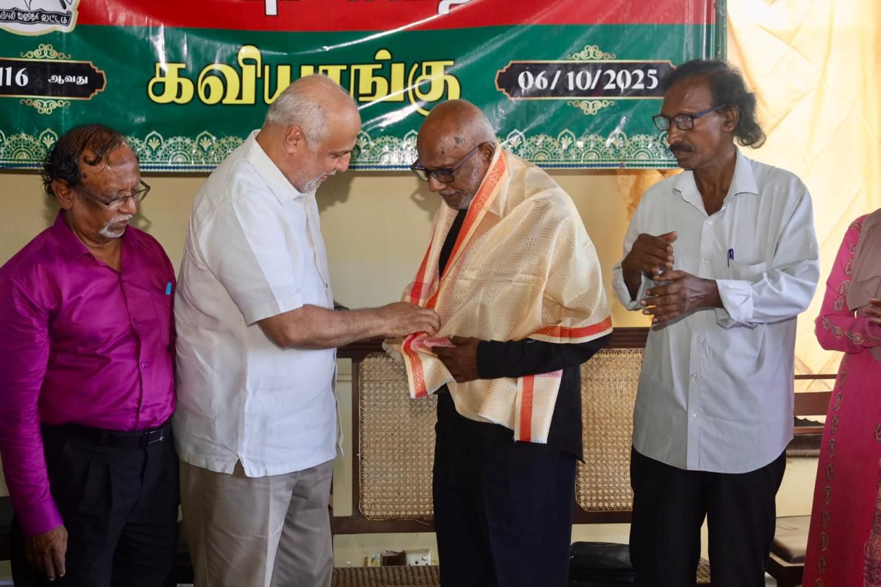 During this session, VAKAVAM felicitated veteran Tamil poet Kavimamani Al Asoomath, who was recently conferred the prestigious ‘Sahitya Ratna’ state award for the year 2025 by the Government of the Socialist Republic of Sri Lanka. He was honoured with a golden shawl and presented with a memento.