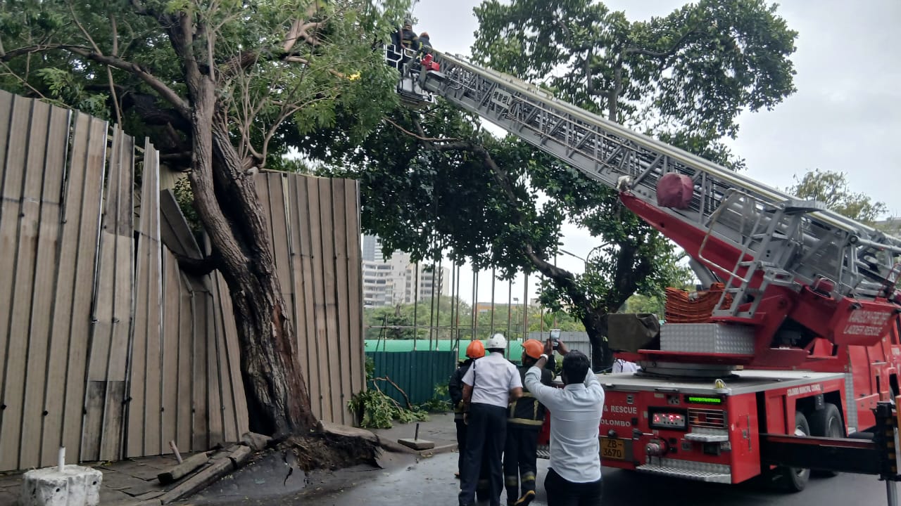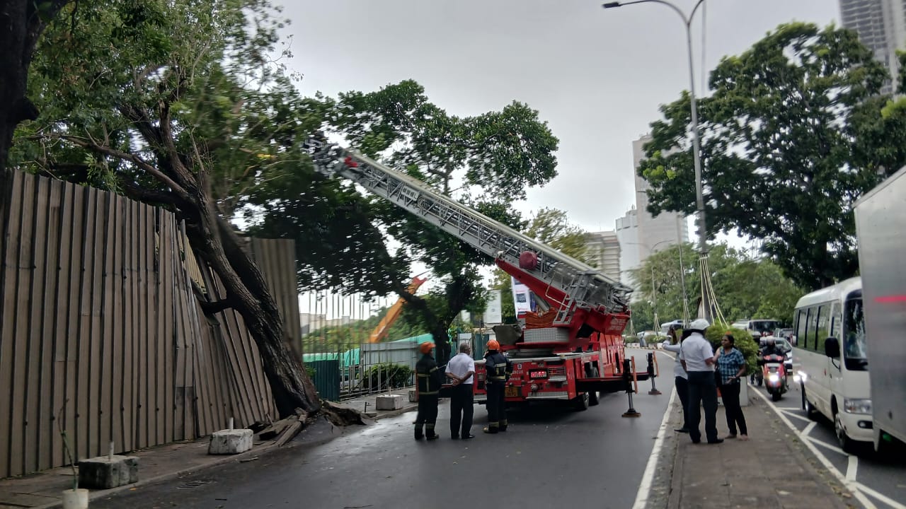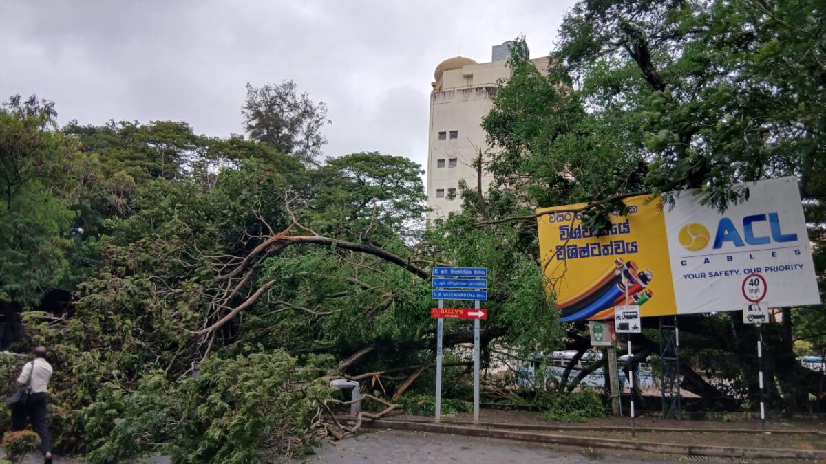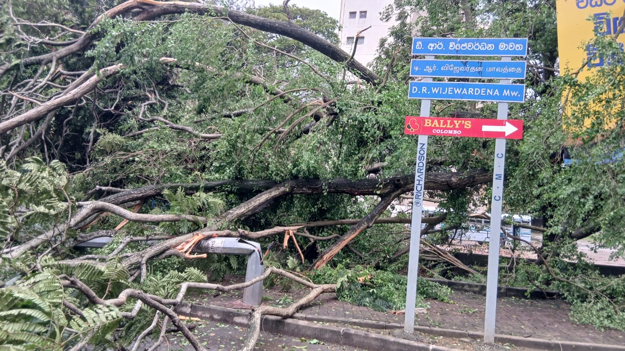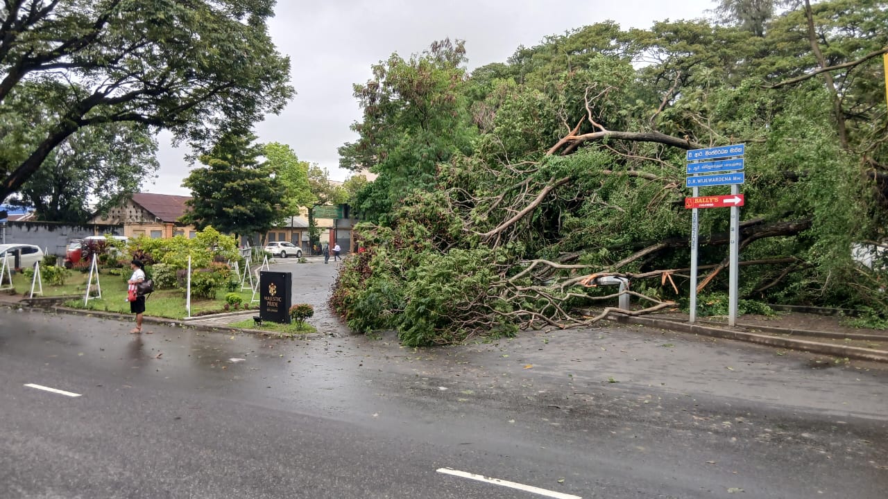 Two large tree that fell near the Gamini roundabout cause severe traffic jam in the morning . The municipal workers were seen busy cutting the trees and clearing Macullum Road free from traffic.