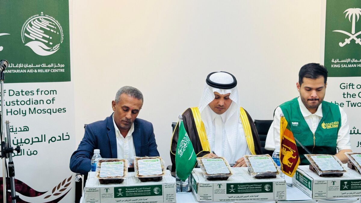 COLOMBO : On behalf of the Custodian of the Two Holy Mosques and through the King Salman Humanitarian Aid and Relief Center,Saudi Ambassador Khalid bin Hamoud Alkahtani gifted 50 tons of dates to Muneer Mulaffer, Deputy Minister of Religious and Cultural Affairs of Sri Lanka on Monday, Feb.16,