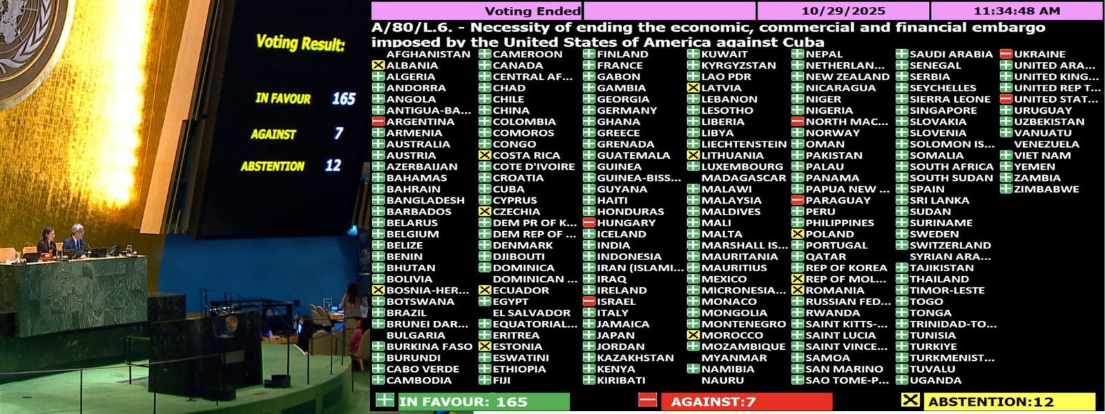 The resolution, titled “Necessity of ending the economic, commercial and financial embargo imposed by the United States of America against Cuba,” was adopted with 165 votes in favor, 7 against, and 12 abstentions.